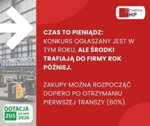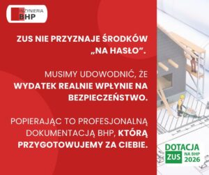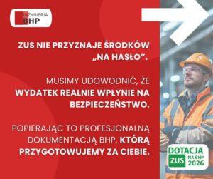 – ZUS nie przyznaje środków „na hasło”. Musimy udowodnić, że wydatek realnie wpłynie na bezpieczeństwo, popierając to profesjonalną dokumentacją BHP, którą przygotowujemy za Ciebie.